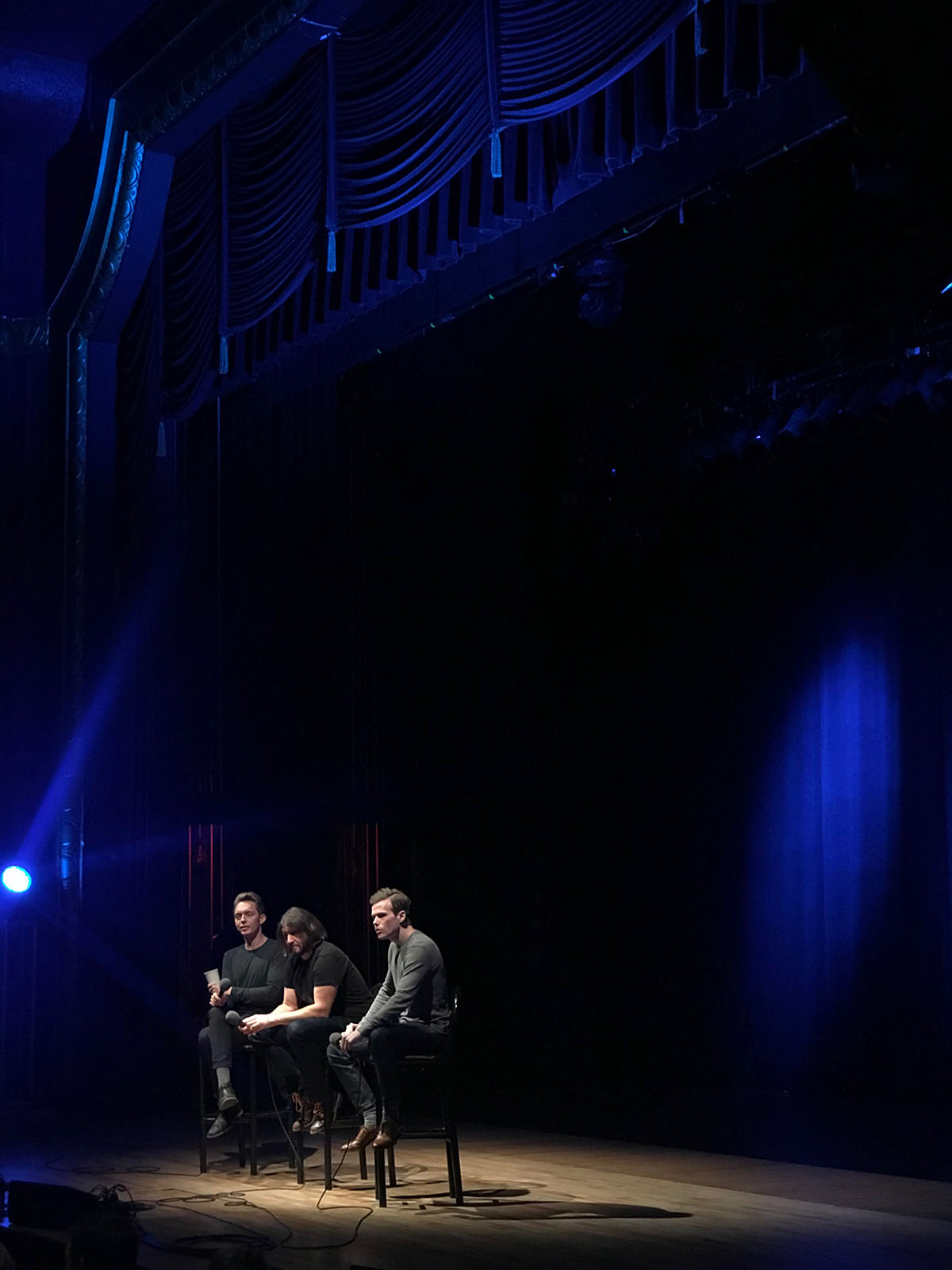 Colin Wright, Joshua Fields Millburn, and Ryan Nicodemus recording a live episode of The Minimalists Podcast in Detroit, Michigan.